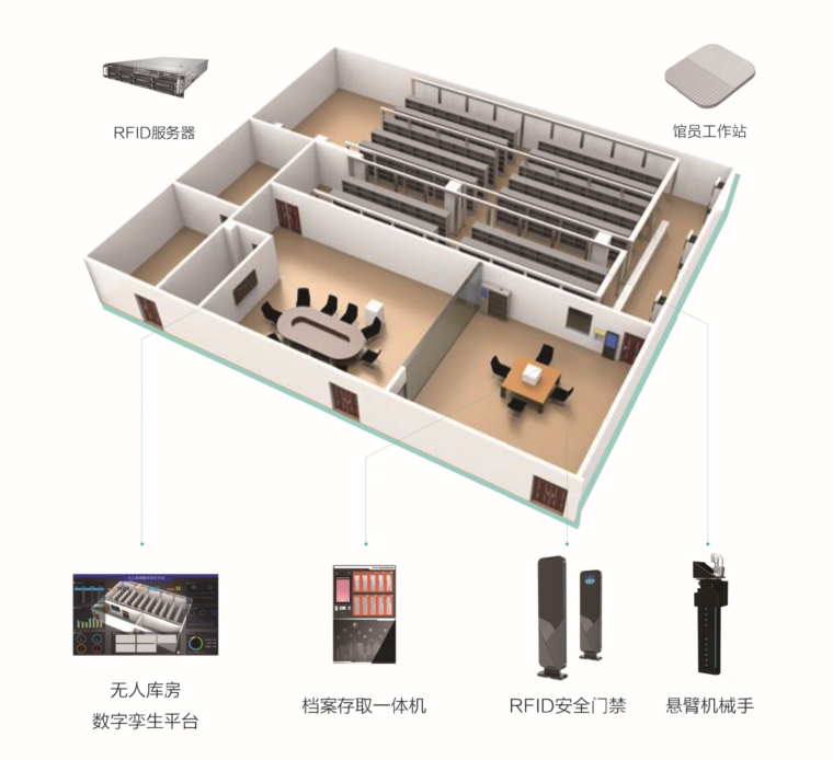智能無人檔案庫房利用工業(yè)級的自動控制技術、RFID自動識別技術與后臺數(shù)據(jù)庫管理系統(tǒng)相結(jié)合,通過深度融合RFID、高精度定位、視覺識別、自動控制等技術于一體的機械手實現(xiàn)檔案全自動上架、下架、精確盤點操作,結(jié)合環(huán)境監(jiān)控、視頻監(jiān)控、三維展示等實現(xiàn)對庫房檔案的無人化、自動化、智能化、可視化管理和全過程跟蹤。